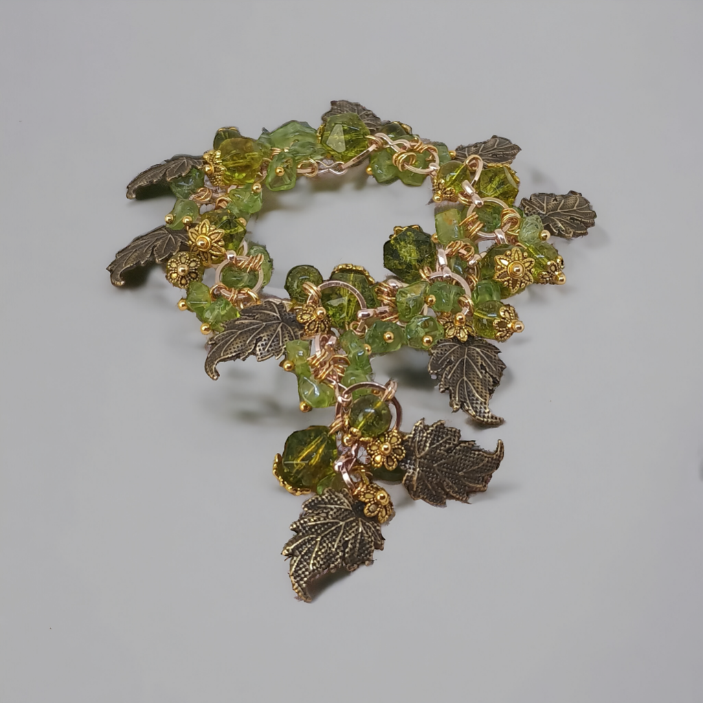 Bransoletka z naturalnych ,czystych i pięknych Peridotów wykonana z elementów miedzianych w kolorze złotego mosiądzu z dodającymi uroku liściami.Solidnie wykonana o długości całkowitej 23 cm.Rozmiar określam jako uniwersalny gdyż można bez problemu dopasować do ręki.Na życzenie mogę skrócić bransoletkę.