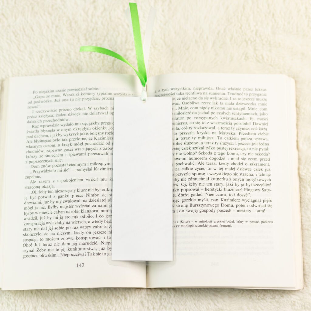 Do zakładki przywiązane są ozdobne satynowe wstążeczki w dwóch kolorach: białym i zielonym.