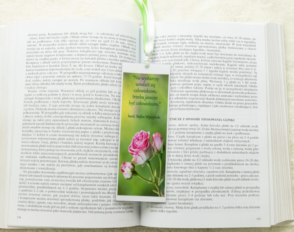 Ta elegancka zakładka to połączenie piękna natury i mądrości, które inspirują do refleksji. Fotografia różowych róż symbolu miłości, delikatności i szacunku oraz ponadczasowego przesłania kard. Wyszyńskiego, które przypomina o wartościach kształtujących naszą ludzką godność i moralność.