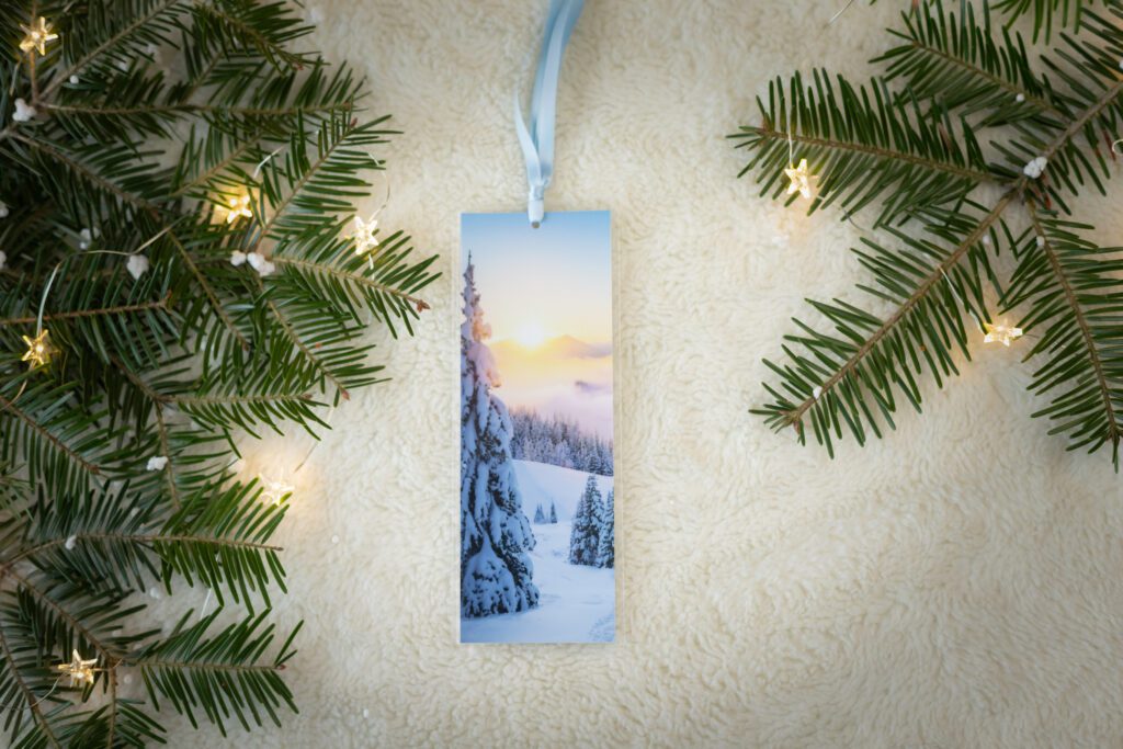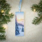 Wzbogać swoją literacką podróż o zakładkę, która przenosi Cię do zimowego świata. Grafika przedstawia majestatyczne, mocno ośnieżone drzewo, góry i las w tle oraz delikatne światło wschodzącego słońca, które wprowadza ciepło w zimową scenerię.